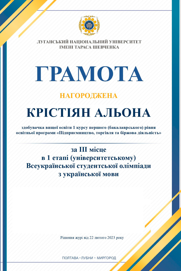 І місце – Симоненко Альона, ОП «Українська мова і література. Мова і література (англійська)»