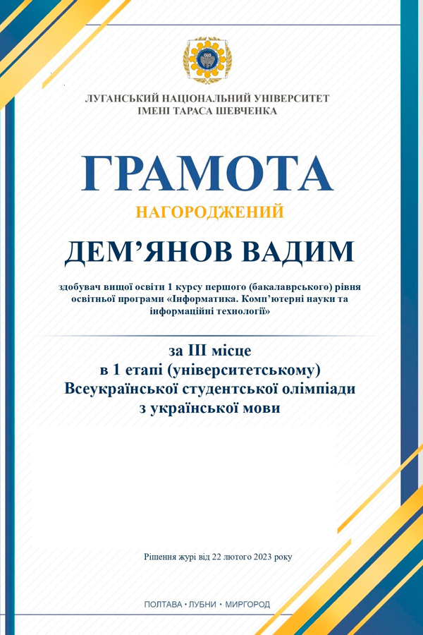 ІІІ місце – Крістіян Альона, ОП «Підприємництво, торгівля та біржова діяльність»; Гриценко Єлизавета, ОП «Менеджмент»; Дем’янов Вадим, ОП «Інформатика. Комп’ютерні науки та інформаційні технології».