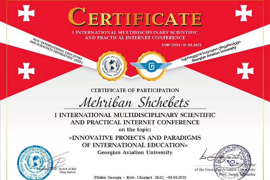 3) Dmytro Sopov, Mehriban Shchebets. To the problem of methods in land management and cadastral research: geographical approach. Innovative projects and paradigms of international education. A collection of theses: materials of I International multidisciplinary scientific and practical Internet conference «Innovative projects and paradigms of international education» (Georgia, Tbilisi, Ukraine, Kyiv, February 28 – March 1, 2023), Georgian Aviation University, 2023, P. 186–188.