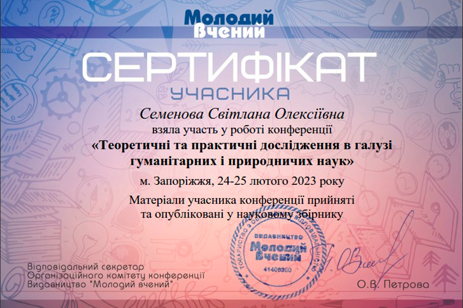 2) Dmytro Sopov, Kateryna Kozlova, Svitlana Semenova. The impact of the Russian-Ukrainian war on the anthropogenic landscapes of eastern Ukraine. Теоретичні та практичні дослідження в галузі гуманітарних і природничих наук : матеріали науково-практичної конференції (м. Запоріжжя, 24-25 лютого 2023 р.). Одеса: Видавництво «Молодий вчений», 2023. С. 25–27.
