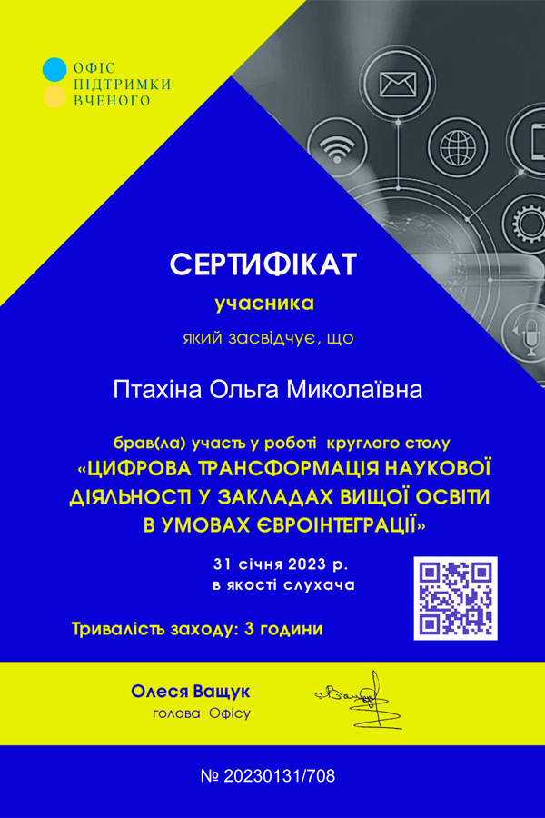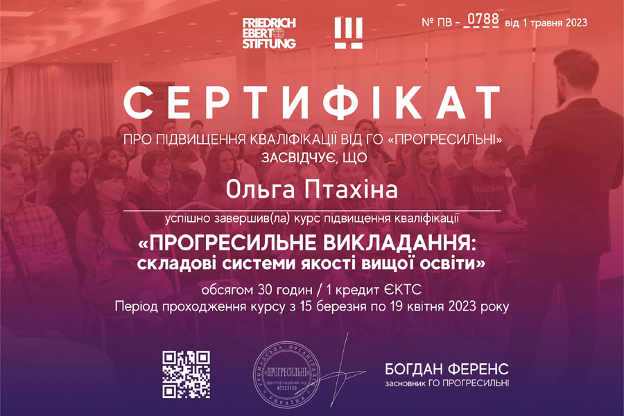 Птахіна Ольга к.п.н., доцент приймала участь у ХХ Міжнародній школі – семінарі «Сучасні педагогічні технології в освіті», що відбувалася в Харкові в Національному технічному університеті «Харківський політехнічний інститут» з 04-08 квітня 2023 року, відвідала серію педагогічних майстерень спрямованих на формування, розвиток та вдосконалення особистісних професійних компетентностей підвищення ефективності професійної діяльності у сфері освіти. Брала участь у роботі круглого столу «Цифрова трансформація наукової діяльності у закладах вищої освіти в умовах євроінтеграції» (31 січня 2023). Пройшла підвищення кваліфікації від ГО «Прогресильні» за напрямом «Прогресильне викладання: складові системи якості вищої освіти» (15 березня- 19 квітня 2023).