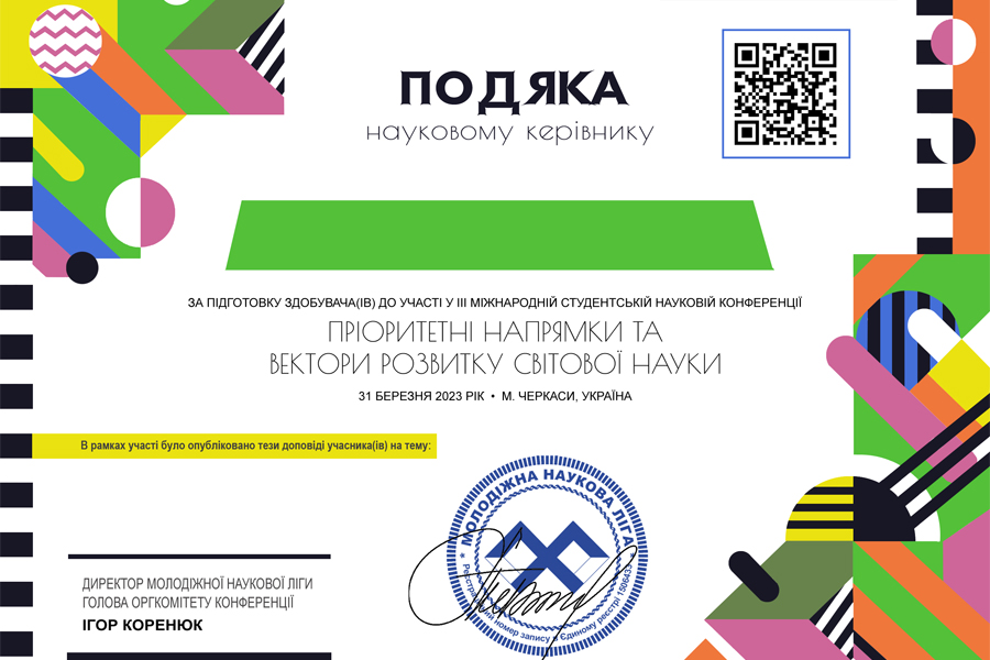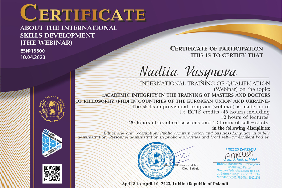 Так к.п.н., доцент Надія Васиньова пройшла онлайн-курси «Дизай-мислення та інновації для НУО», успішно закінчила курс «Взаємодія органів державної влади з громадськістю» (23 березня 2023) через платформу масових відкритих онлайн-курсів Prometheus та отримала сертифікат. Отпримала Подяку за підготовку здобувача до участі у III Міжнародній студенській науковій конференції «Приоритетні напрями та вектори розвитку світової науки» (31 березня 2023, м.Черкаси). Приймала участь у вебінарі «Неформальна освіта і набуття Soft Skills» та отримала сертифікат (28 квітня 2023 року) та Internatinal training of qualifification on the topic «Academic integrity in the training of Masters and Doctors of PHD in countries of European Union and Ukraine» (3-16 April 2023).
