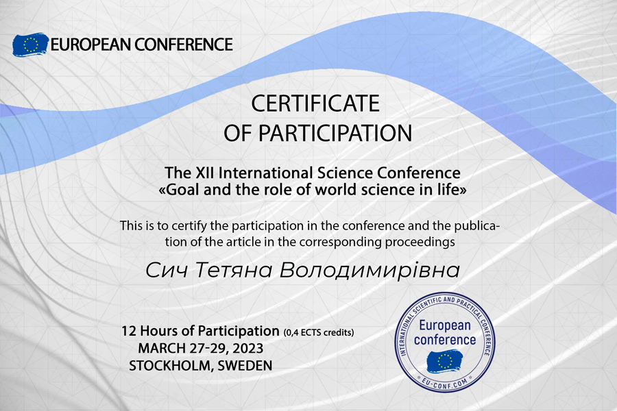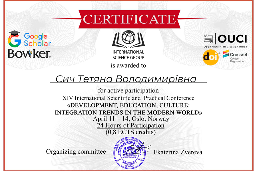 Сич Т.В д.п.н., професор приймала участь у таких міжнародних конференціях як : XІV Internatinal Science and Practical Confarence «Developmant, Education and Culture: integration trends in the modern word» (Norway, 11-14 April 2023); XІI Internatinal Science Confarence «Goal and the role of word science in life» (Sweden, 27-29 March 2023). Прослухала тренінг-курс за індивідуальною програмою «ПІДГОТОВКА НАУКОВИХ ПРОЄКТІВ ДО ПОДАННЯ НА ГРАНТ. ГРАНТОВІ ПРОГРАМИ ДЛЯ НАУКОВЦІВ» в обсязі 15 год. (0,5 кредитів ЄКТС) 23-25 січня 2023 р. і отримала теоретичні та практичні знання згідно програми: Міжнародні наукові гранти, їх особливості та типологія. Пошук інформації по актуальних грантових заявках та партнерів в рамках гранту. Специфіка оформлення і подання заявок на різні грантові програми. Теорія та практика досягнення успіху у конкурсах програми Горизонт Європа 2023-2024 року (сертифікат № 109).