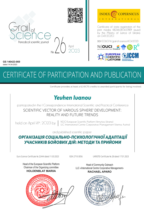 Іванов Євген к.п.н, доцент приймав участь у таких міжнародних конференціях як: I «Scientific vector of various sphere development: reality future and trends» (26 April 2023); The V Internatinal Science Confarence «Priority directions of science developmant»; The X Internatinal Science Confarence «Innovative ways of learning developmant» (13- 15 March, 2023 р., Varna, Bulgaria); ІV міжнародній науковій конференції «Наукові тренди постіндустріального суспільства» (31 березня 2023, м. Суми); Міжнародної науково-практичної конференції «Сучасний стан та перспективи розвитку науки, освіти, технологій та суспільства» (лютий 2023, м. Кременчук, Україна).