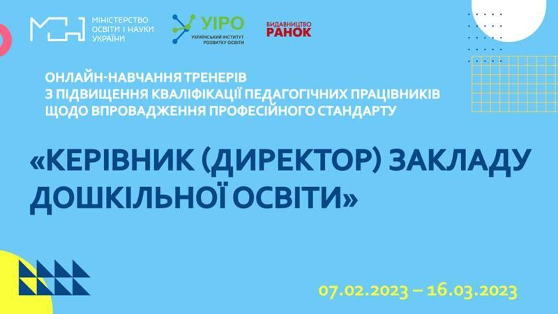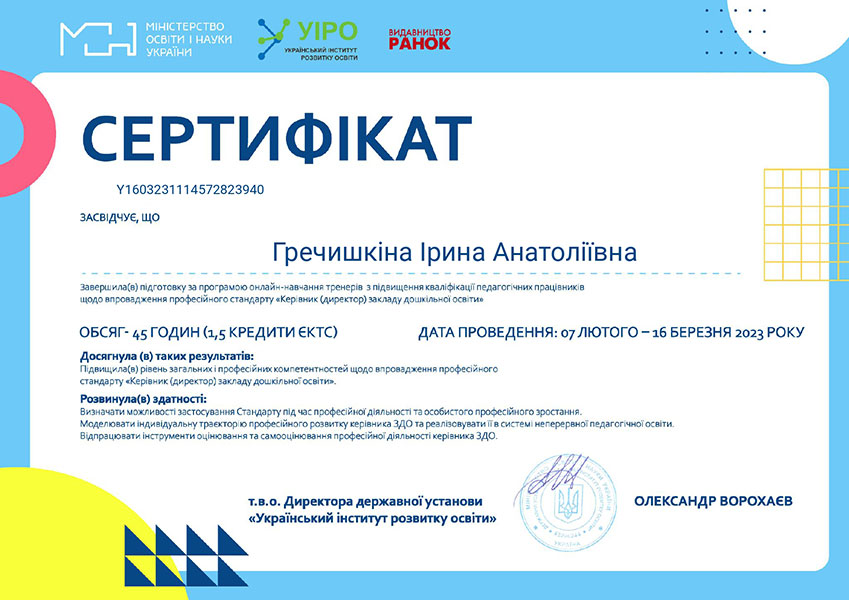 Так, з 7.02-16.03.2023 к.пед. н., старший викладач кафедри Гречишкіна Ірина Анатоліївна пройшла онлайн-навчання за темою «Імплементація професійного стандарту «Керівник (директор) закладу дошкільної освіти».