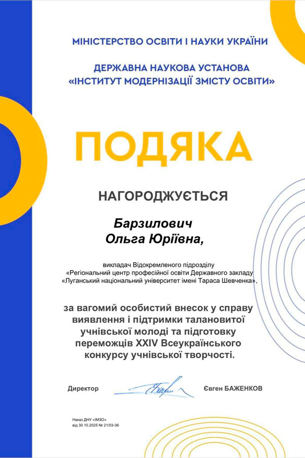 Подяка від Державної наукової установи «Інститут модернізації змісту освіти»