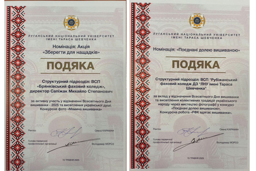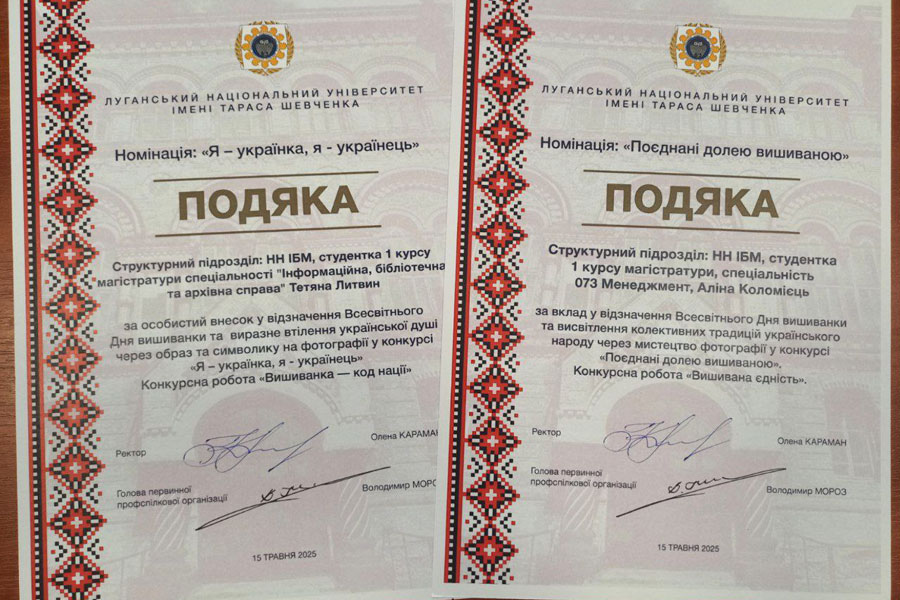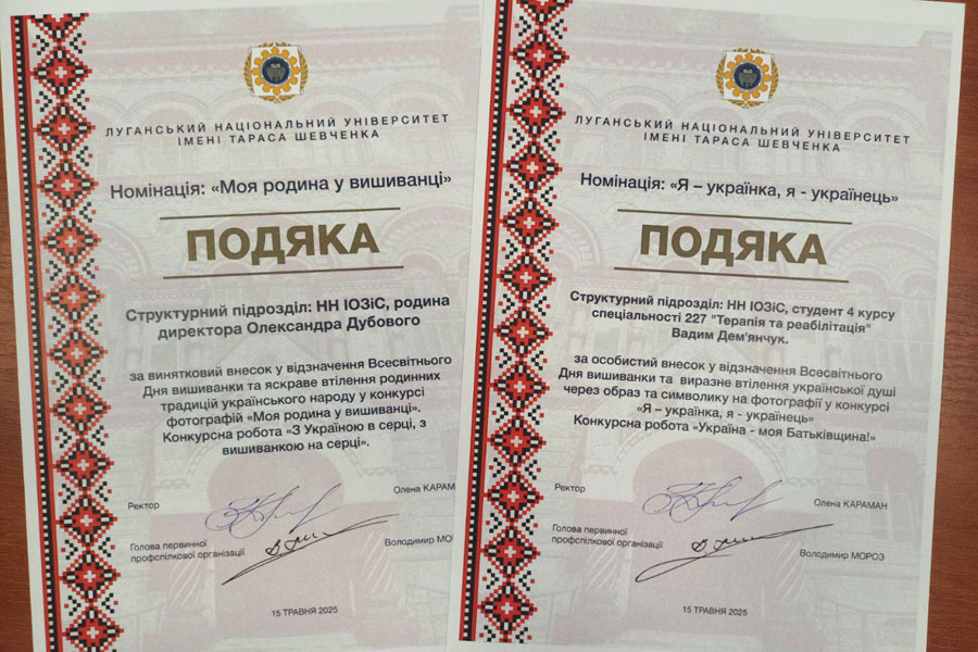 Усі переможці конкурсів, проведених до Всесвітнього дня вишиванки, у різних номінаціях були відзначені Подяками від Луганського національного університету імені Тараса Шевченка та Первинної профспілкової організації університету.