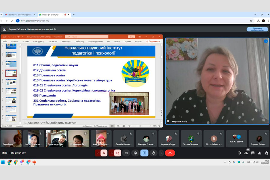 Зустріч розпочалася із привітання В.В. Криворукої, яка відзначила актуальність проблеми вибору майбутньої професії для випускників. Модератор заходу від університету ознайомила присутніх з перевагами й умовами навчання в університеті, підкресливши унікальність закладу вищої освіти, який готує висококваліфікованих фахівців для різних галузей, проконсультувала потенційних студентів з питань вступу. Директори навчально-наукових інститутів: педагогіки і психології, мистецтв, охорони здоров’я і спорту, секретар приймальної комісії розповіли абітурієнтам про професії, які можна здобути у структурних підрозділах та запросили випускників коледжу на навчання до університету. Завідувачі кафедр НН ІПП надали загальну інформацію про спеціальності, освітні програми, шляхи майбутнього працевлаштування, організацію освітнього процесу в інституті та цікаве студентське життя.