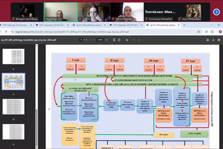 Гаранти програм приділили окрему увагу особливостям ОП, зокрема їх унікальності серед інших подібних програм в університетах України, а також окреслили можливості індивідуальної траєкторії навчання засобами дисциплін вільного вибору. Крім того, виступала проф. Юган Наталія, яка повідомила про розроблені нею освітні компоненти, присвячені сучасній японській літературі.