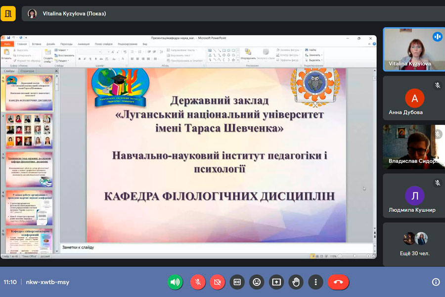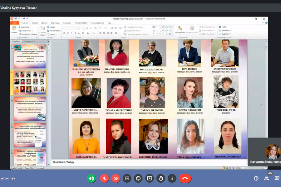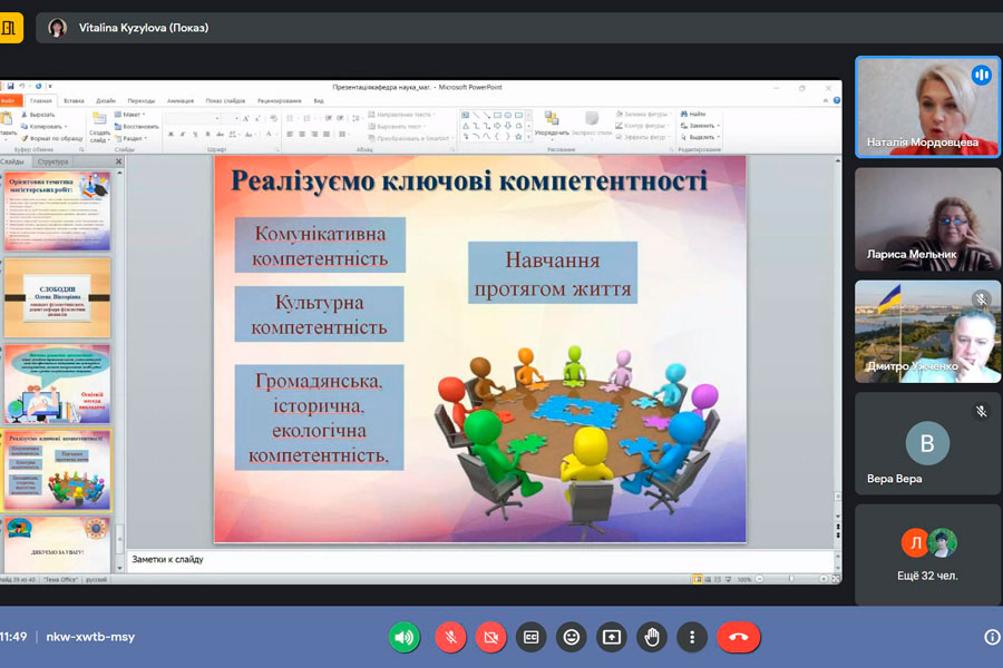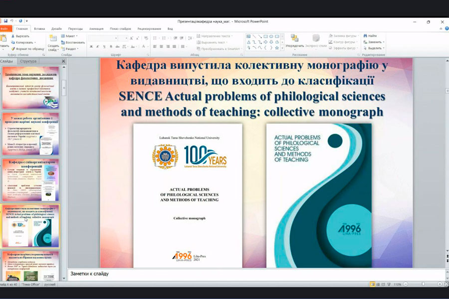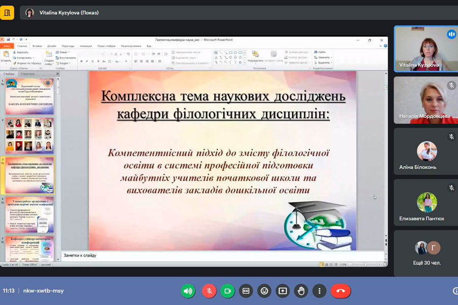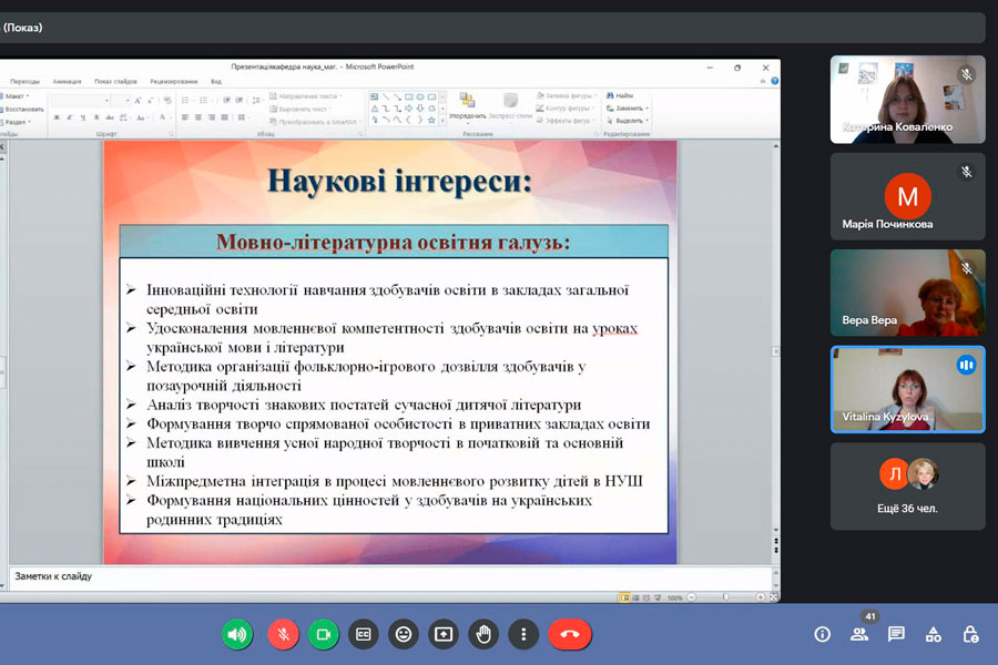 Кафедра філологічних дисциплін ознайомила здобувачів спеціальностей «Початкова освіта», «Початкова освіта. Українська мова і література» з комплексною кафедральною темою, в межах якої працюють науково-педагогічні працівники, тематикою й напрямами роботи наукових і науково-практичних конференцій, семінарів, щорічно організованих кафедрою («Мова й література в проекції різних наукових парадигм», «Стратегічні пріоритети філології й лінгводидактики в умовах реформування освітньої системи в Україні» та ін.); проінформувала їх щодо можливості участі у наукових заходах всеукраїнського й міжнародного рівнів. Магістрантам було представлено основні кафедральні наукові й навчально-методичні праці (колективні й одноосібні монографії, посібники, підручники, словники, збірники наукових праць, періодичні видання). Викладачі кафедри мали можливість продемонструвати власні напрацювання в межах тематики наукових досліджень, поділитися досвідом співпраці із магістрантами-випускникам минулих років, запропонувати цікаві й актуальні в сучасній освітній системі України напрями роботи.