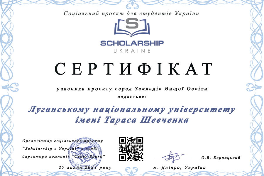 За таку плідну роботу кафедри економіки, маркетингу та підприємництва наш університет у числі кращих закладів вищої освіти України одержав Сертифікат активного учасника соціального проєкту «Scholarship в Україні» (за кількістю переможців у чотирьох номінаціях ДЗ «Луганський національний університет імені Тараса Шевченка» – на рівні інших двох найкращих учасників цьогорічного конкурсу: КНУ ім. Тараса Шевченка й Університету митної справи та фінансів).
