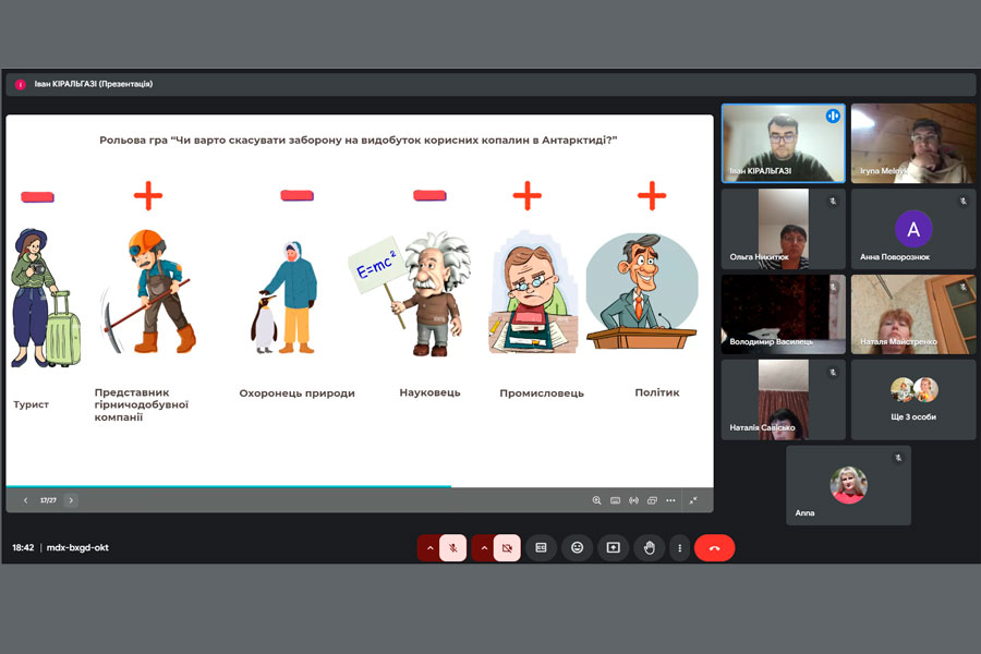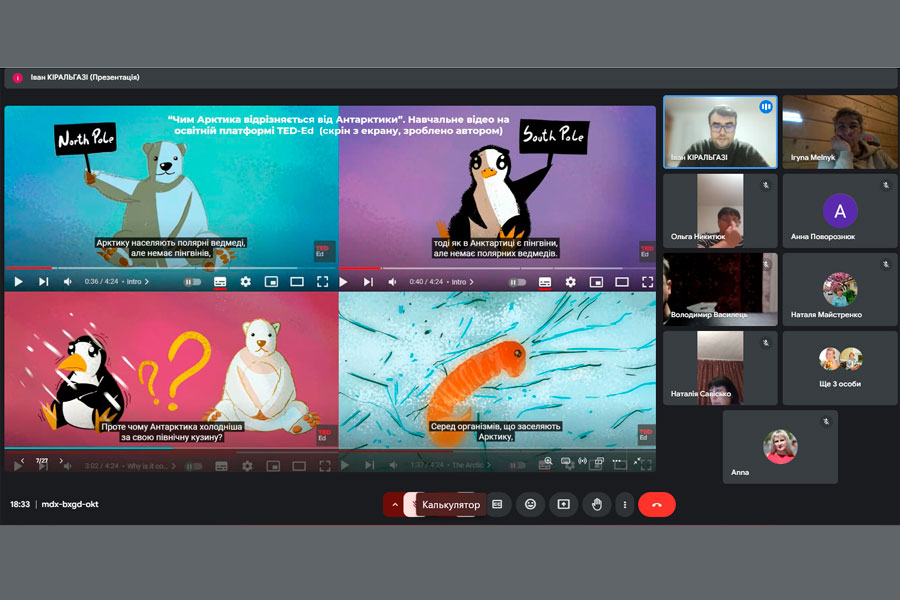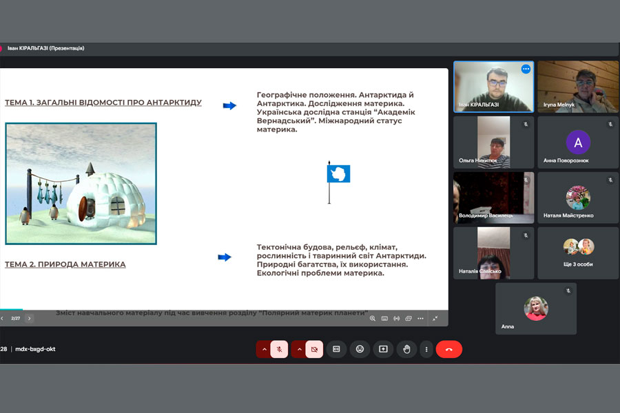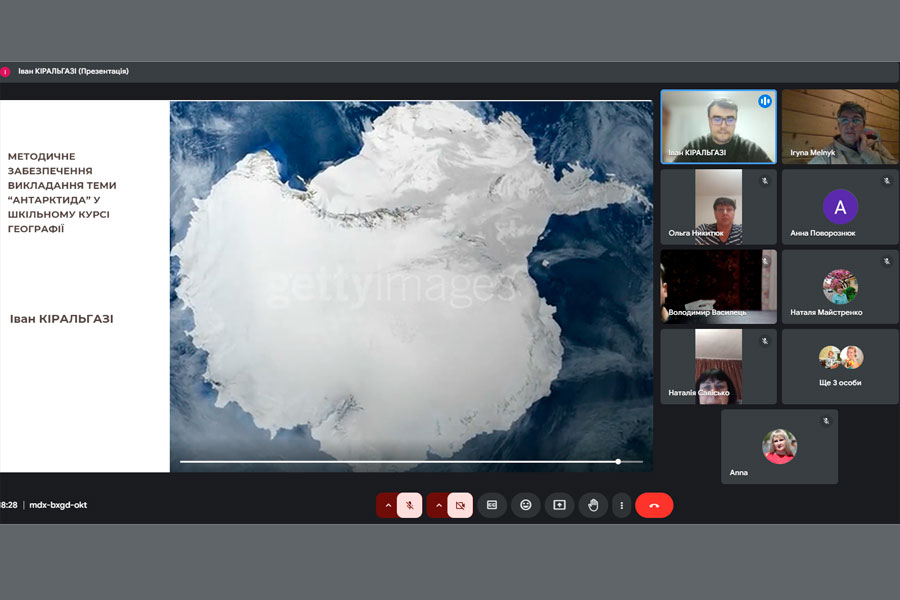 На спільному засіданні магістрант кафедри Іван КІРАЛЬГАЗІ презентував доповідь на тему «Методичне забезпечення викладання теми «Антарктида» у шкільному курсі географії». Доповідач зазначив, що на перший погляд може здатися, що удосконалення методичних аспектів викладання теми «Антарктида» не є актуальним: цей материк у шкільному курсі географії вивчається вже багато років, отже його навчально-методичне забезпечення у жодному разі не може бути незадовільним. Однак слід розуміти, що «ландшафт географічної освіти» знаходиться у стані постійних змін, саме тому вчителям географії необхідно присвячувати час та енергію для розвитку свого предмета, для опанування нових технологій, форм, методів та прийомів навчання, якщо вони хочуть зацікавити та надихнути своїх учнів, довести їм, що якісна географічна освіта має значні переваги. Пан Кіральгазі акцентував увагу присутніх на тому, що Антарктида – це континент, який відіграє ключову роль у розумінні глобальних екосистем і кліматичних процесів, а також є унікальною природною лабораторією для наукових досліджень.