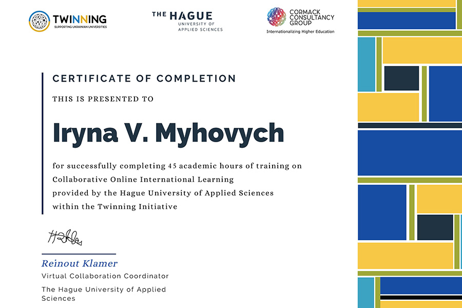 В рамках реалізації проєкту TWINNING: Supporting Ukrainian Universities (https://www.twinningukraine.com/) директор інституту міжнародної освіти ЛНУ імені Тараса Шевченка, доктор педагогічних наук, професор, Ірина Мигович пройшла навчання в Гаазькому університеті прикладних наук, Гаага, Нідерланди, за програмою Collaborative Online International Learning.