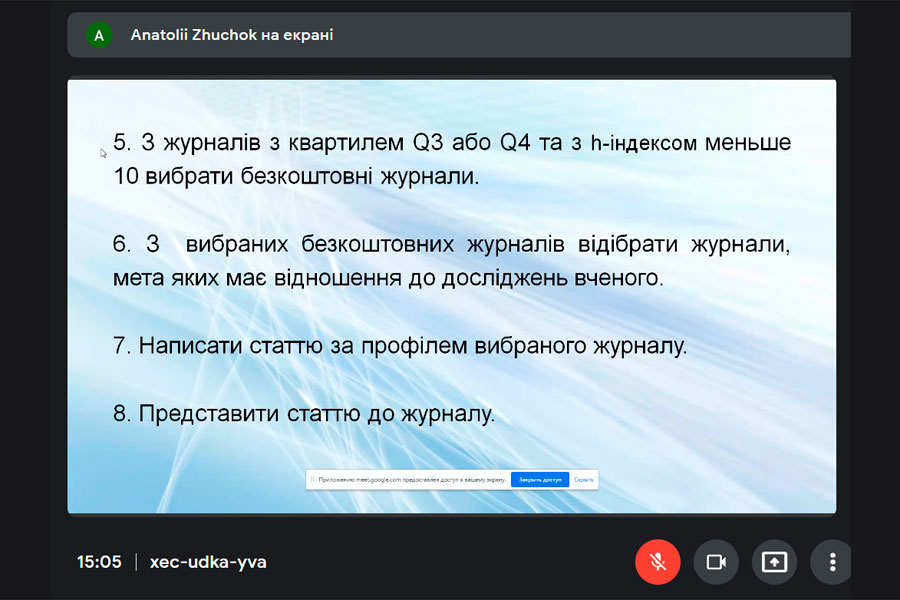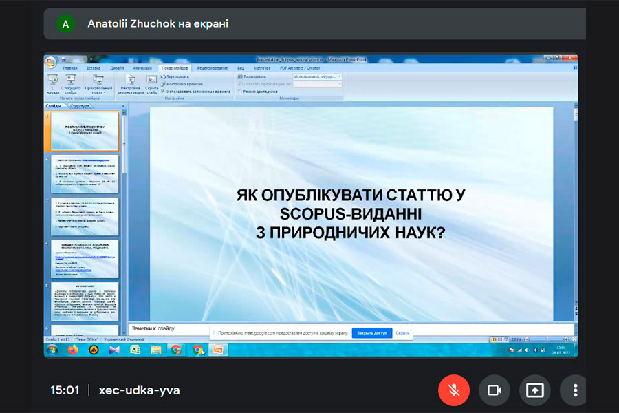 Під час зустрічі Анатолій Жучок представив презентацію у якій наглядно показав основні кроки розміщення та публікації статті у Scopus-виданні саме з природничих наук. Доповідачем також було надано приклади пошуку та розкрито детальну схему подання публікацій за сучасними умовами.