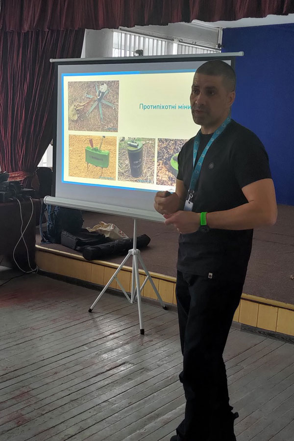 Олексій розповів про вибухонебезпечні предмети, саморобні, протипіхотні та протитранспортні вибухові пристрої, міни-пастки, типи травм, які можна отримати при контакті з вибухонебезпечними предметами.