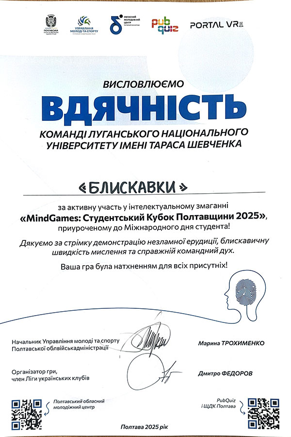 12 листопада студентське самоврядування навчально-наукового інституту мистецтв ЛНУ імені Тараса Шевченка взяло участь у інтелектуальному змаганні «Mind Games: Студентський Кубок Полтавщини 2025» приурочений до Міжнародного дня студента.