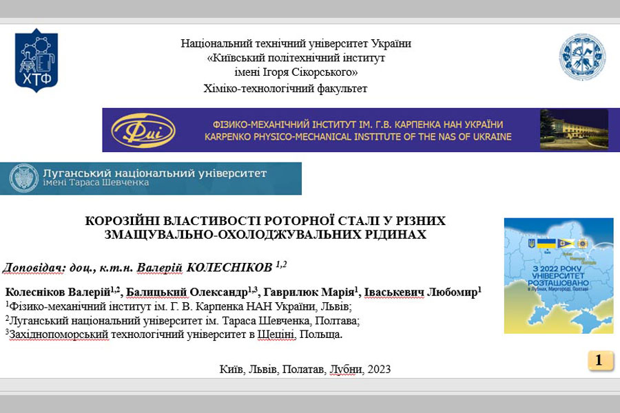 На конференцію були надіслані тези та були представлені результати спільної наукової роботи: «Корозійні властивості роторної сталі у різних змащувально-охолоджувальних рідинах». Автори та співавтори: Колесніков Валерій (ДЗ «Луганський національний університет ім. Тараса Шевченка», Полтава;), Балицький Олександр (Фізико-механічний інститут ім. Г. В. Карпенка НАН України, Львів; Західнопоморський технологічний університет в Щеціні, Польща.), Гаврилюк Марія (Фізико-механічний інститут ім. Г. В. Карпенка НАН України, Львів), Іваськевич Любомир (Фізико-механічний інститут ім. Г. В. Карпенка НАН України, Львів).