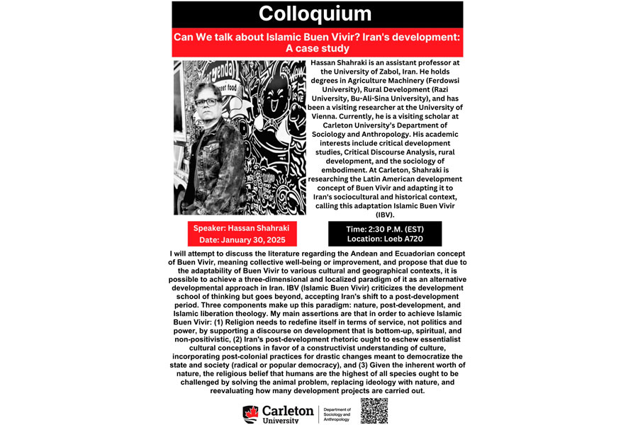 Тема колоквіуму: Can We talk about Islamic Buen Vivir? Iran’s development: A case study. (Чи можемо ми говорити про ісламський Buen Vivir? Розвиток Ірану: вивчення випадку). Доповідь для обговорення зробив професор з Ірану Hassan Shahraki (Хасан Шахракі), який зараз є запрошеним науковцем в Карлтонському університеті.