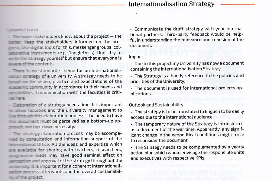 Крім інтенсивної навчальної складової (воркшопи, менторські сесії, нетворкінг-зустрічі, онлайн-презентації тощо), ознайомлення з кращими міжнародними практиками та обміну досвідом щодо інтернаціоналізації академічних проєктів, програма стажування також передбачала підготовку кожним з учасників індивідуального проєкту щодо можливостей та перспектив розвитку цього напряму в ЗВО, який він представляє.