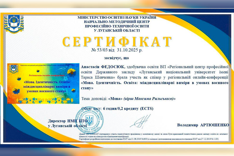 Анастасія Федосюк, студентка І курсу Відокремленого підрозділу «Регіональний центр професійної освіти» Державного закладу «Луганський національний університет імені Тараса Шевченка», гідно представила навчальний заклад, узявши участь як спікерка у регіональній онлайн-конференції «Мова. Ідентичність. Освіта: міждисциплінарні виміри в умовах воєнного стану».