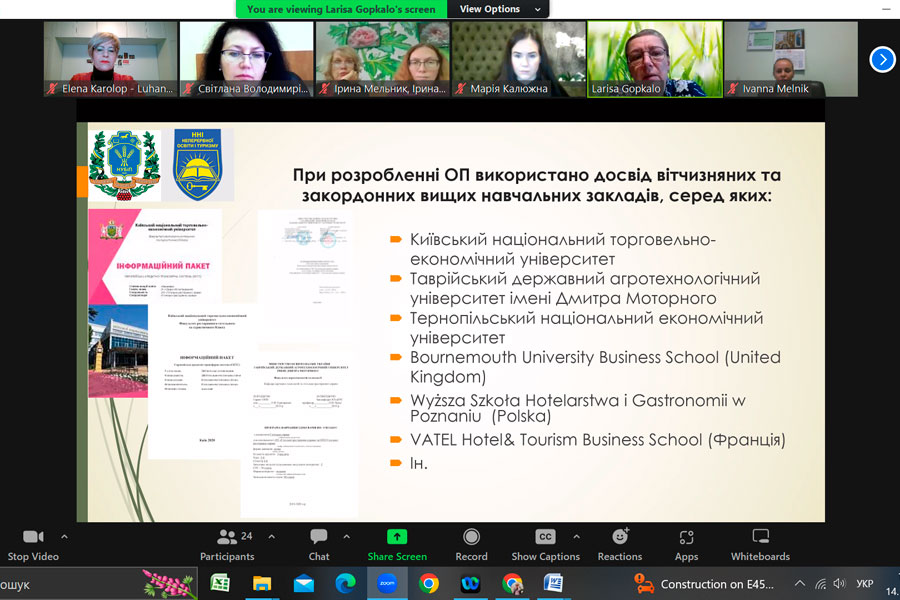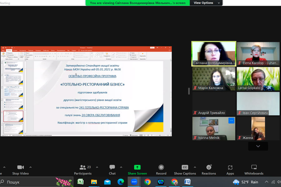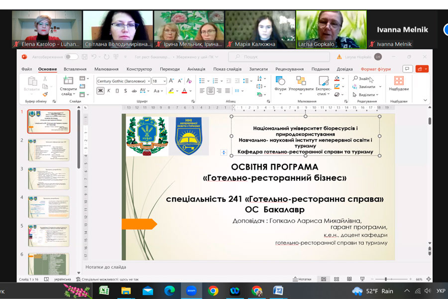 Про важливість врахування практико-орієнтованої складової під час підготовки здобувачів другого (магістерського) рівня вищої освіти зазначила гарант програми, завідувачка кафедри готельно-ресторанної справи та туризму, модератор заходу Світлана Мельниченко. Вона відмітила про нові підходи щодо формування змістовної частини освітньої програми обумовлені потребами ринку в нових кадрах, що уміють вирішувати проблеми, креативно мислити, використовувати інноваційні цифрові технології, бути емоційно стійкими та клієнтоорієнтованими. Започаткування та реалізація даної освітньої програми спрямована на підготовку фахівців здатних ідентифікувати та розв’язувати складні задачі і проблеми, що передбачають проведення досліджень, організацію сервісної та інноваційної діяльності суб’єктів готельно-ресторанного бізнесу з метою прийняття ефективних рішень в умовах невизначеності та з урахуванням еко-трендів. При формуванні освітньої складової враховано, у тому числі, і специфіку Національного університету біоресурсів і природокористування України. Було представлено досвід формування освітніх програм за даною спеціальністю вітчизняними та закордонними закладами вищої освіти і можливість врахування найкращих європейських практик.
