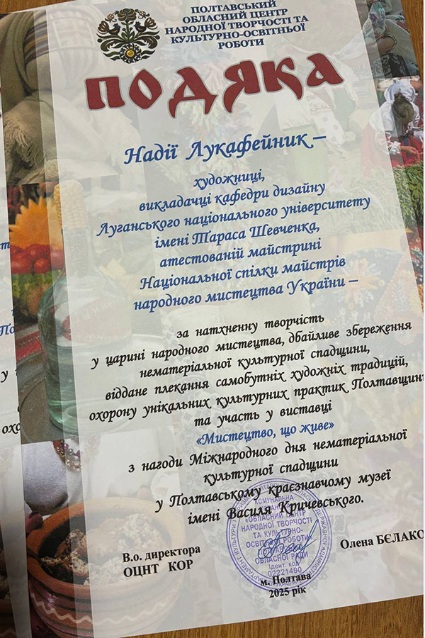 Здобувачі освітніх програм В3 «Декоративне мистецтво та ремесла» і В4 «Образотворче мистецтво та реставрація» кафедри образотворчого та декоративно-прикладного мистецтва НН ІМ Луганського національного університету імені Тараса Шевченка — Надія Лукафейник, Вікторія Шнукало, Вероніка Дядюк, випускниця магістратури Катерина Хижняк, а також гарант освітньої програми «Декоративне мистецтво та ремесла», кандидат педагогічних наук, доцент, член Національної спілки майстрів народного мистецтва України Наталія Миколаївна Дігтяр — взяли участь у заході, присвяченому Міжнародному дню охорони нематеріальної культурної спадщини ЮНЕСКО.