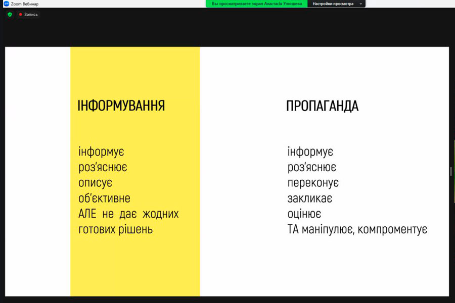 З метою формування у студентської молоді негативного ставлення до російської пропаганди та створенню ефективної системи протидії дезінформації у закладах освіти 01 лютого 2024 року відбулася онлайн-зустріч викладачів та здобувачів першого (бакалаврського) рівня вищої освіти кафедри романо-германської філології з інспектором відділу зв’язків з громадськістю управління патрульної поліції у Київській області Департаменту патрульної поліції Іванченко Євгенією «Протидія негативним інформаційним та психологічним впливам».
