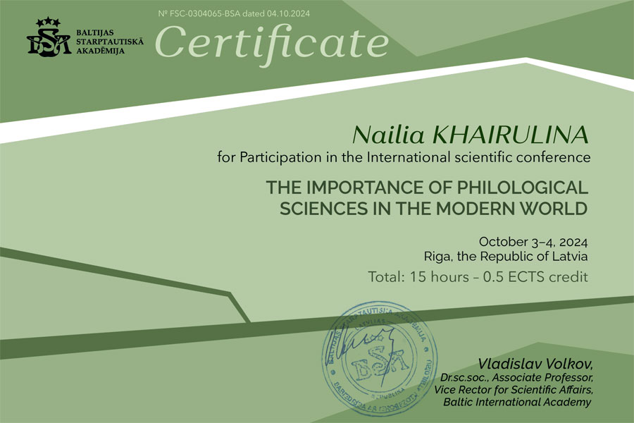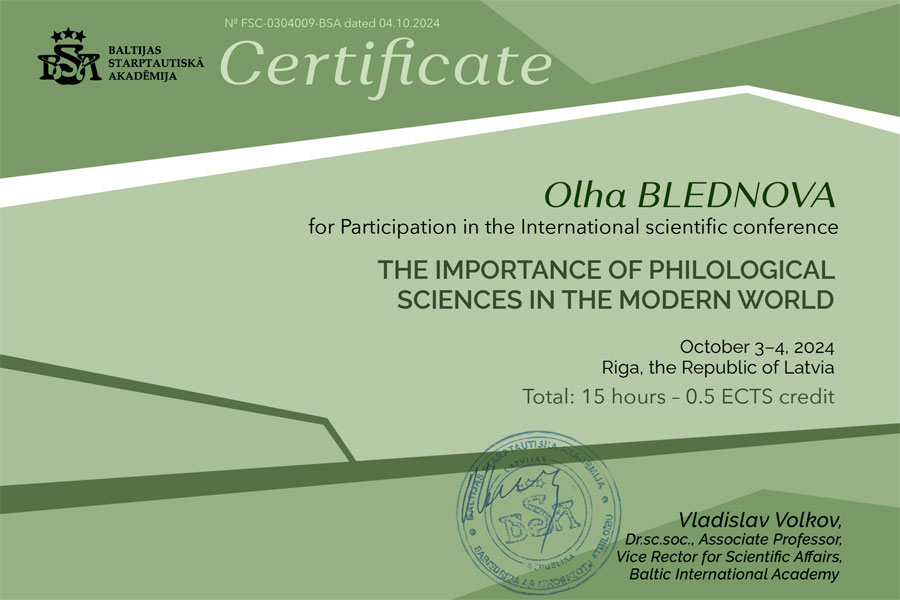 Нещодавно представники кафедри: Хайруліна Н.Ф., Тишакова Л.Т. та Бледнова О.Г. успішно представили доповіді на Міжнародній конференції “Важливість філологічних наук у сучасному світі”, яка відбулася 3-4 жовтня 2024 року (м. Рига, Латвія).