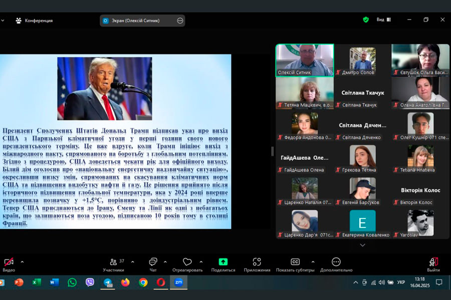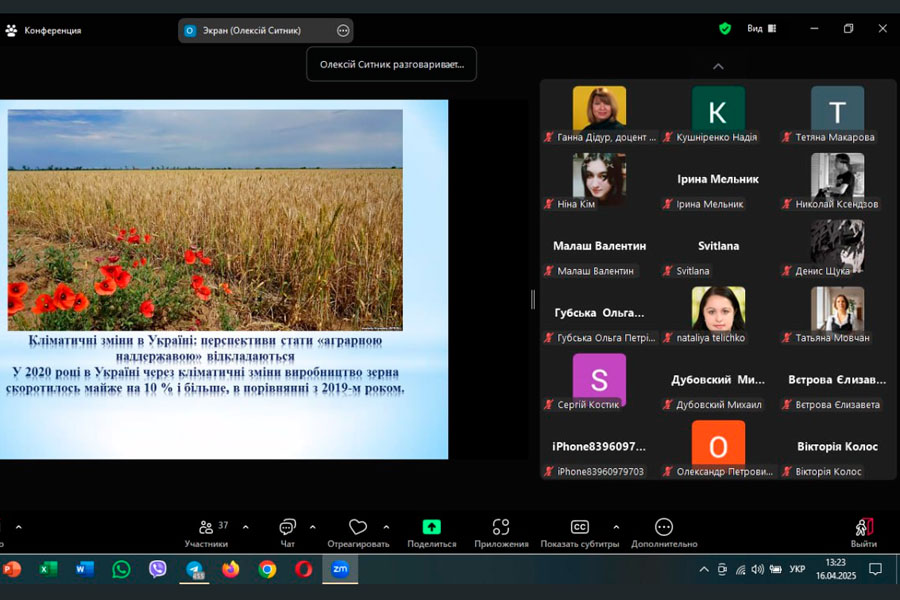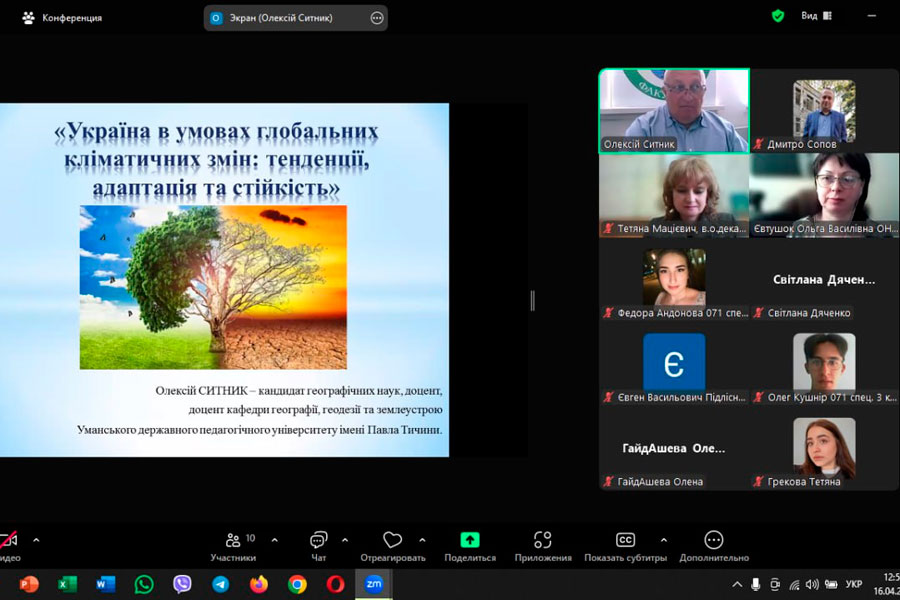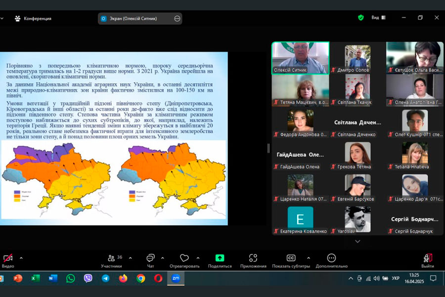 Лектор – Ситник Олексій Іванович, кандидат географічних наук, доцент, доцент кафедри географії, геодезії та землеустрою Уманського державного педагогічного університету імені Павла Тичини – детально розповів про кліматичні зміни в Україні. Особливу увагу лектор приділив стратегіям адаптації, які Україна може і повинна впроваджувати. Пан Ситник наголосив, що адаптація до змін клімату – це не просто реакція на кризу, а проактивний підхід, який може перетворити виклики на можливості. Він розповів про інноваційні практики в аграрному секторі, як-от використання посухостійких сортів рослин і сучасних меліоративних систем, які здатні підвищити врожайність сільськогосподарських культур, наголосив на необхідності впливати на гідрометеорологічні процеси з метою виходу із кліматичної кризи.