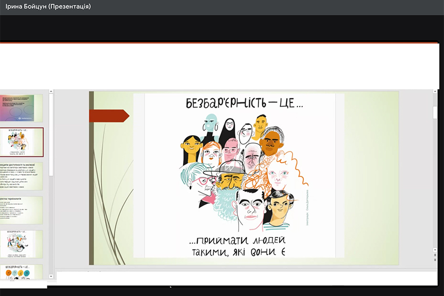 Спікерка вебінару, заступниця директора з соціально-гуманітарної роботи ННІФІЖ Ірина Бойцун ознайомила присутніх з цільовими напрямами Стратегії безбар’єрності, що спрямована на забезпечення доступності й адаптивності для всіх соціальних груп населення незалежно від віку, стану здоров’я, статі, місця проживання та інших ознак, акцентувала на коректності у спілкуванні й використанні термінів тощо.