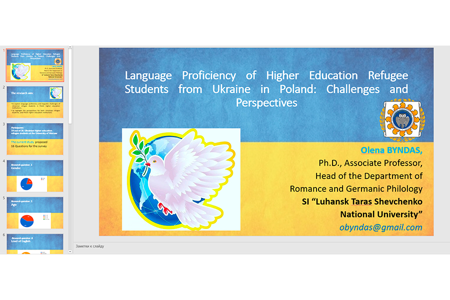 Завідувачка кафедри романо-германської філології, к.пед.н., доцент Олена Биндас виступила на пленарному засіданні з доповіддю «Language proficiency of higher education refugee students from Ukraine in Poland: Challenges and perspectives» («Рівень володіння мовою студентів-біженців з України в Польщі: виклики та перспективи»). Перший етап дослідження було проведено зі здобувачами вищої освіти з України, які стали вільними слухачами кафедри сучасних мов Варшавського університету, Польща. Із 26 здобувачів з українських закладів вищої освіти на співпрацю погодились лише 14: із ДЗ «Луганський національний університет імені Тараса Шевченка», Сумського державного педагогічного університету імені А. Макаренка, Харківської гуманітарно-педагогічної академії, Житомирського державного університету імені Івана Франка, Прикарпатського національного університету імені Василя Стефаника, Харківського національного університету імені Г. Сковороди, Тернопільського національного педагогічного університету імені В. Гнатюка, Національного університету «Одеська юридична академія», Київського національного лінгвістичного університету тощо.