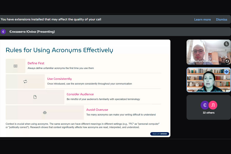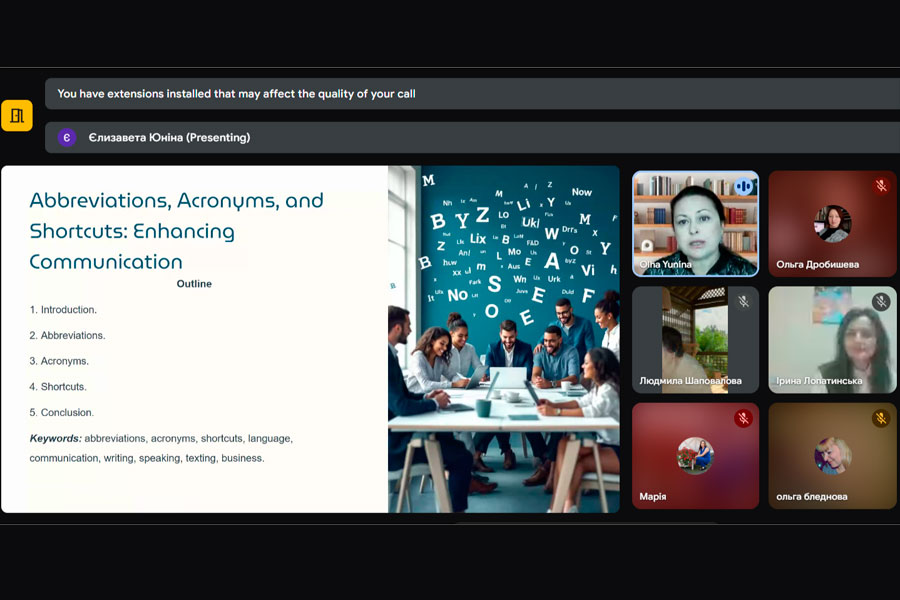 Під час лекції Ольга Юніна ґрунтовно розкрила поняття абревіацій, акронімів і скорочень як важливого елементу сучасного англомовного дискурсу, зокрема в контексті професійного та неформального спілкування. Особливу увагу було приділено практичним аспектам вживання таких мовних одиниць у засобах масової інформації, соціальних мережах, діловому листуванні, а також у молодіжному сленгу.