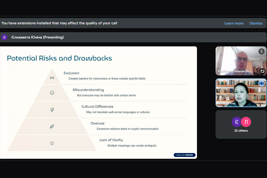 Здобувачі вищої освіти активно долучалися до обговорення, демонструючи високий рівень зацікавленості в тематиці лекції. У форматі інтерактивного діалогу вони розпізнавали скорочення в автентичних англомовних текстах, пояснювали їх значення та доречність вживання залежно від комунікативної ситуації, ділилися власними спостереженнями щодо адаптації таких одиниць у міжмовному просторі.