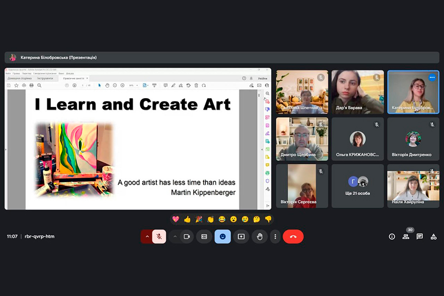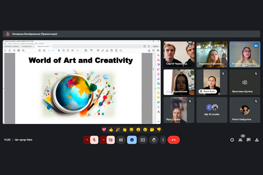 15 листопада 2024 р. Білобровська Катерина Олександрівна, доктор філософії за спеціальністю 035 Філологія, викладач кафедри іноземних мов за професійним спрямуванням провела відкрите заняття на тему: «I Learn and Create Art» («Я вивчаю та створюю мистецтво») в межах освітнього компонента «Іноземна мова за професійним спрямуванням» для здобувачів вищої освіти 4-го курсу першого (бакалаврського) рівня освітньої програми «Ведучий програм телебачення» спеціальності 021 «Аудіовізуальне мистецтво та виробництво», освітньої програми «Образотворче мистецтво» спеціальності 023 «Образотворче мистецтво, декоративне мистецтво, реставрація», освітньої програми «Музичне мистецтво» спеціальності 014 «Середня освіта», освітньої програми «Музичне мистецтво» спеціальності 025 «Музичне мистецтво», освітньої програми «Хореографія» спеціальності 024 «Хореографія», освітньої програми «Графічний дизайн» спеціальності 022 «Дизайн».