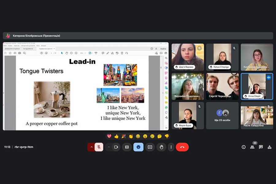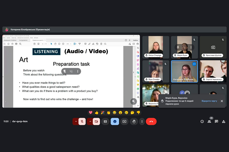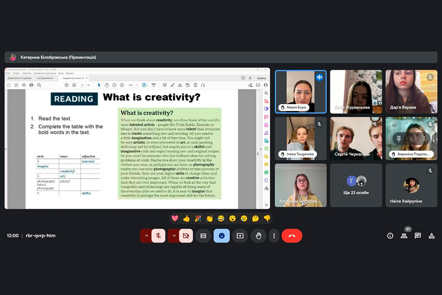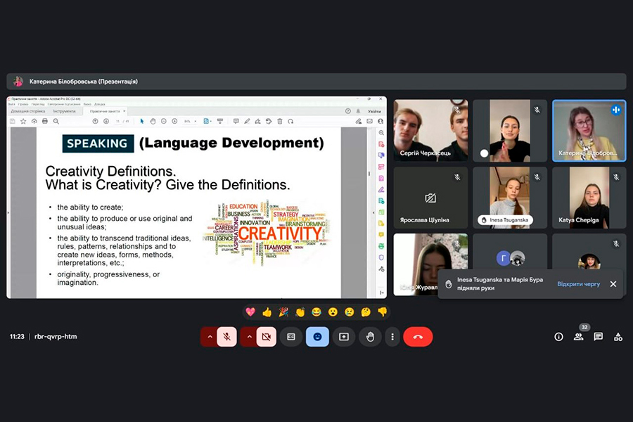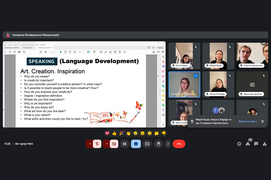 Заняття було логічно побудоване з дотриманням усіх методичних вимог. Викладач чітко спланувала цілі і завдання. На всіх етапах заняття, що були послідовно пов’язані між собою, Катерина Білобровська вміло застосовувала методи та прийоми активізації пізнавальної діяльності здобувачів вищої освіти, використала технології інтерактивного навчання, поглибила знання здобувачів з лексичних тем «Art», «Creativity», «Inspiration» («Мистецтво», «творчість», «натхнення», граматичної теми «Used to». Методи предметно-мовного інтегрованого навчання дозволили досягнути впевненого рівня взаємодії зі здобувачами та отримати позитивний зворотній звʼязок. Така форма проведення заняття допомогла активізувати пізнавальну діяльність здобувачів, удосконалити навички співпраці, спілкування; розвивати творче й критичне мислення, загальну ерудицію та культуру, аналітичні та комунікативні здібності здобувачів; сприяла формуванню професійно орієнтованої комунікативної компетентності.