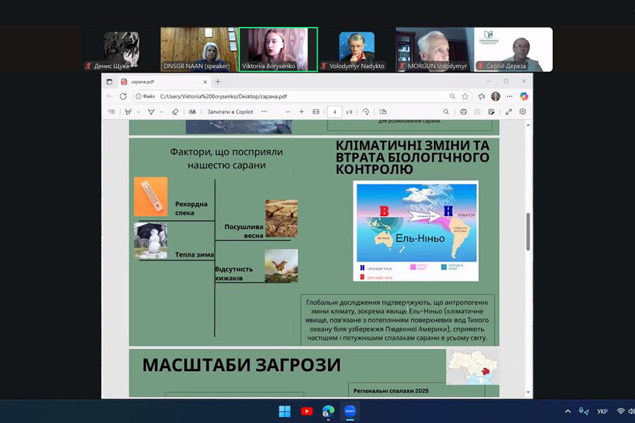 Вікторія представила доповідь «Нашестя сарани в Україні як загроза екологічній та продовольчій безпеці в умовах війни», де ґрунтовно показала, як зміни екосистем, біологічні загрози та стан ґрунтів впливають на аграрний сектор під час воєнного стану. Професійну підтримку у підготовці дослідження надала науковий керівник кандидат сільськогосподарських