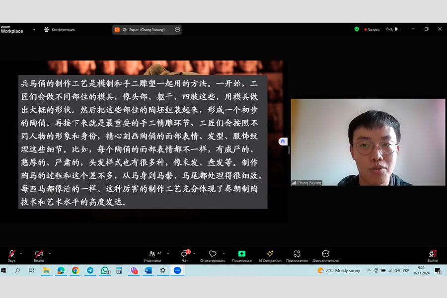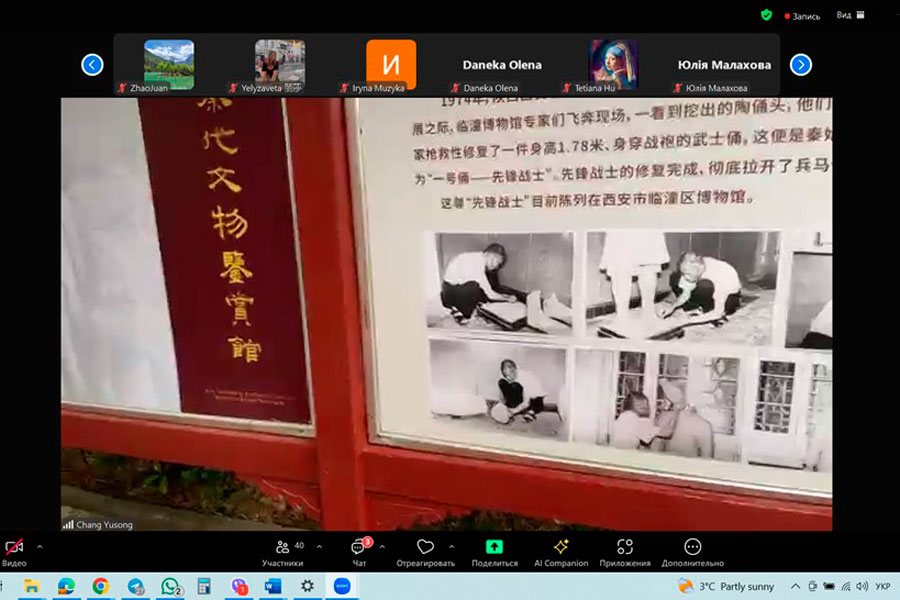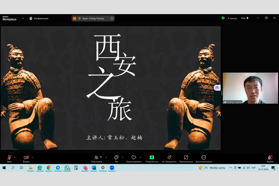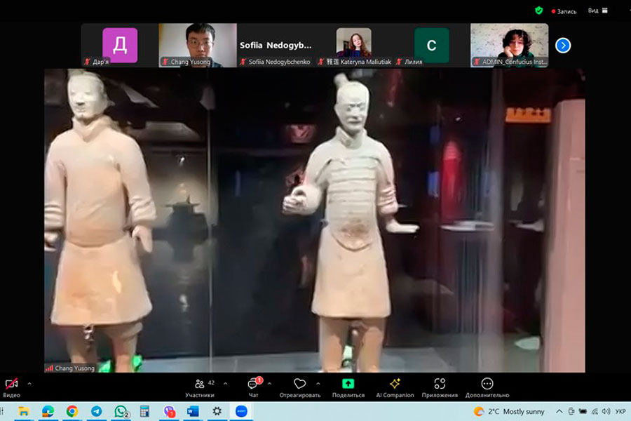 16 листопада здобувачі освіти першого (бакалаврського) рівня освітньої програми «Мова і література (китайська, англійська)» та другого (магістерського) рівня «Мова і література (китайська)» разом із своїми викладачами, Перепадею Дар’єю та Малаховою Юлією долучилися до унікальної онлайн-лекції на тему «Славетні пам'ятки міста Сіань», котра проходила в Інституті Конфуція Харківського національного університету ім. В.Н. Каразіна. Лекція супроводжувалася стрімінгом прямо із 秦始皇兵马俑博物馆 (Музей теракотового війська у гробниці імператора Цінь Ши Хуанді), м. Сіань, КНР. Лекцію провів Чан Юйсун, викладач Інституту Конфуція.