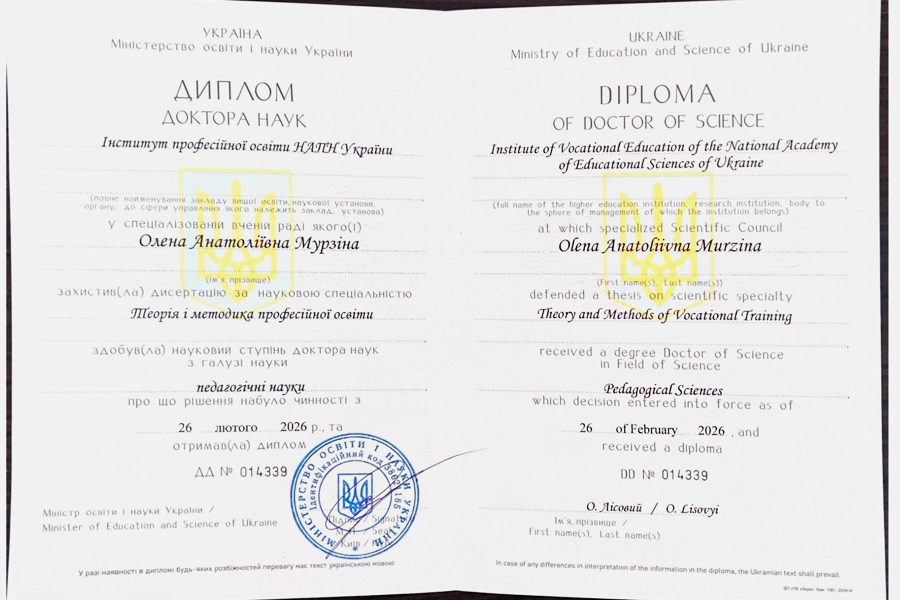 У спеціалізованій вченій раді Інституту професійної освіти Національної академії педагогічних наук України Олена Анатоліївна успішно захистила дисертацію за науковою спеціальністю «Теорія і методика професійної освіти» та здобула науковий ступінь доктора наук з галузі педагогічних наук. Відповідне рішення набуло чинності 26 лютого 2026 року.