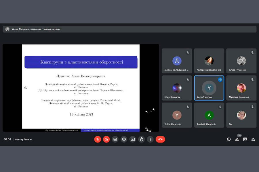 19 квітня аспірантка ЛНУ ім. Т. Шевченка зі спеціальності 111 – «Математика» Алла Луценко захистила дисертацію «Квазігрупи з властивостями оборотності» на здобуття ступеня доктора філософії з математики. Захист відбувся в змішаній очно-дистанційній формі у м. Лубни Полтавської області, де зараз розташований адміністративний корпус університету. Зі вступним словом виступив Юрій Жучок, голова разової спеціалізованої вченої ради, завідувач кафедри алгебри та системного аналізу, д.ф.-м.н., професор, який розповів про наявність всіх необхідних для захисту документів здобувачки. Далі Алла Луценко представила основні результати своєї дисертації, головна мета якої – дослідження властивостей квазігруп з властивостями оборотності. Після закінчення презентації відбулася наукова дискусія, члени ради задали питання та висловили власні оцінки. Зокрема, науковий керівник аспірантки, Федір Сохацький, д.ф.-м.н., доцент Донецького національного університету імені Василя Стуса відзначив цінність отриманих результатів роботи та особисті якості аспірантки.