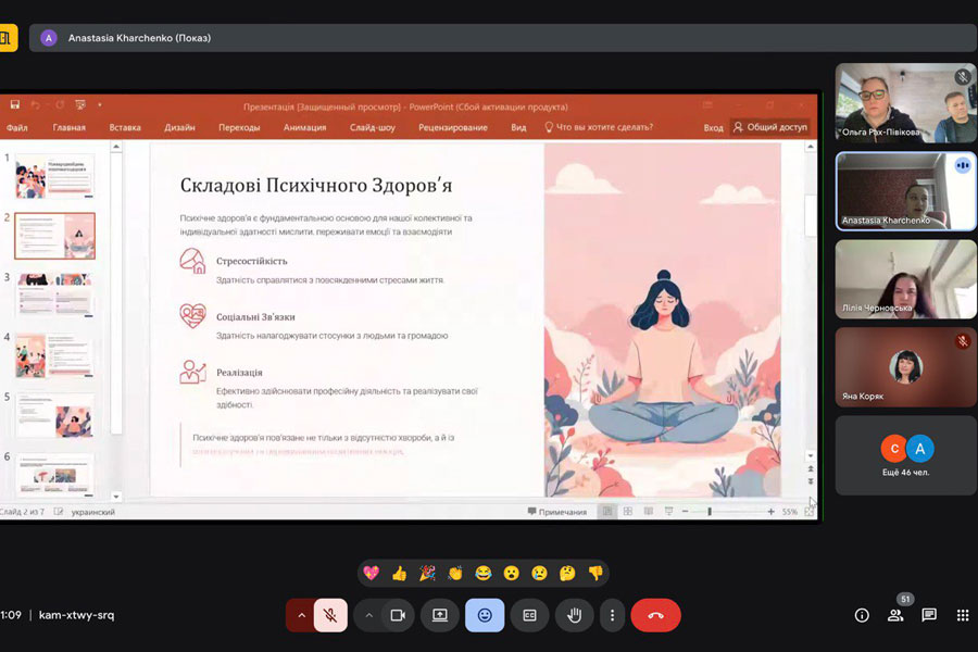 На заході Харченко А. А. зробила теоретичну і історичну розвідку події: вперше День ментального здоровʼя відзначений у 1992 році за ініціативою Всесвітньої федерації психічного здоров’я, основна місія: підвищити обізнаність, зменшити стигму та мобілізувати дії на підтримку психічного здоров’я у світі. Також було розкрито складові психічного здоровʼя.