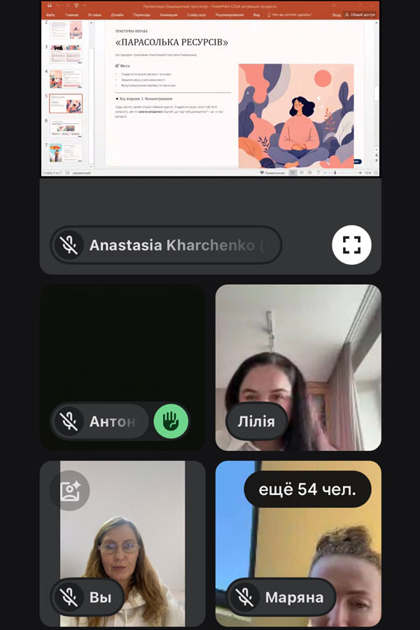 У практичній частині заходу професор Черновська Л. В. детально розкрила та провела техніки саморегуляції. Саморегуляція – це управління своїм психоемоційним станом, що досягається шляхом впливу людини на саму себе за допомогою слів, уявних образів, управління м’язовим тонусом і диханням.