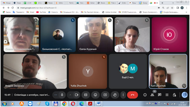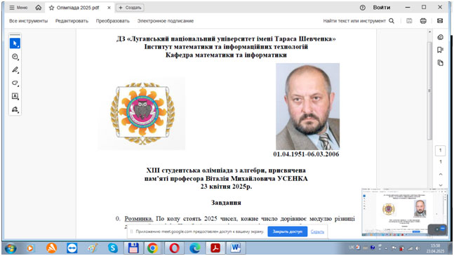 23 квітня у навчально-науковому інституті математики та інформаційних технологій в рамках днів науки та роботи дослідницької групи з алгебри «AlgebraResearchGroup» (ARG) за допомогою популярного сервісу онлайн-комунікацій GoogleMeet пройшла вже традиційна XІII студентська алгебраїчна олімпіада, присвячена пам’яті видатного українського алгебраїста, доктора фізико-математичних наук, професора Віталія Михайловича Усенка. Вчений працював у нашому університеті з 2001 по 2006 роки і за цей період вніс значний вклад у розвиток алгебри в Луганській області та Україні. За ініціативою професора В.М.Усенка в 2002 році був організований відомий на сьогодні в світі математичний журнал «Algebra and Discrete Mathematics», який з 2012 року включений в міжнародну наукометричну базу даних Scopus, а з 2016 – в базу даних Emerging Sources Citation Index (Web of Science), і наразі за SchimagoJournal&CountryRank цей журнал має квартиль Q3.