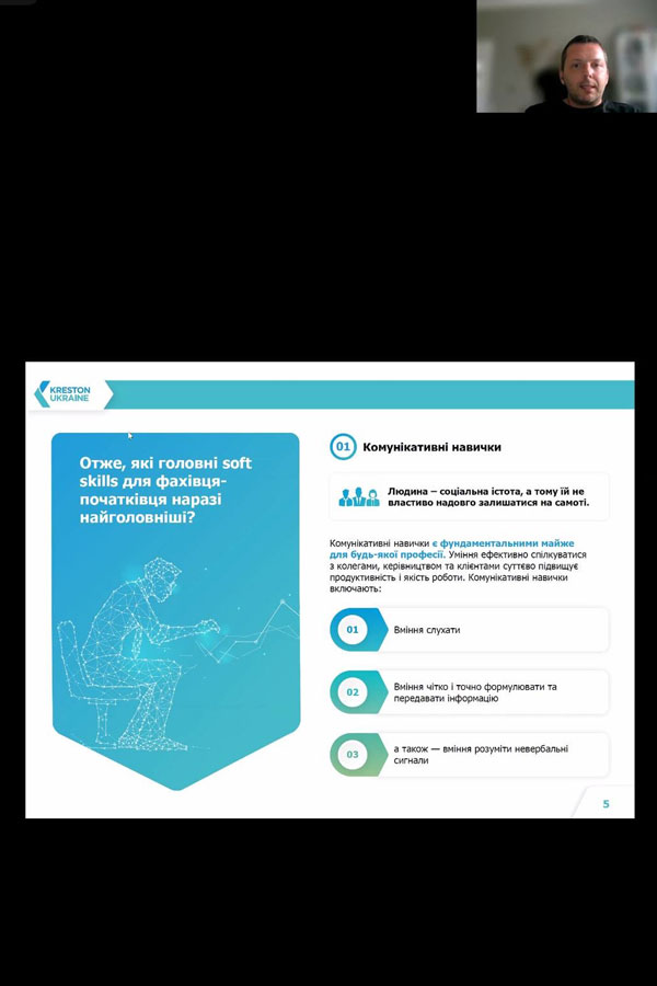 Під час заходу обговорювались основні відмінності жорстких та мʼяких навичок у професіонала в різних галузях знань, ділились досвідом розробки методичних матеріалів щодо формування цих навичок у студентів закладів вищої освіти. Пан Андрій акцентував свою увагу на формуванні у майбутніх професіоналів саме комунікативних навичок, навичок самопрезентаціі, вміння працювати в команді, критично мислити, гнучкість та адаптивність, навички емоційного інтелекту. Поділився своїм досвідом розвитку цих навичок у компанії Kreston Ukraine.