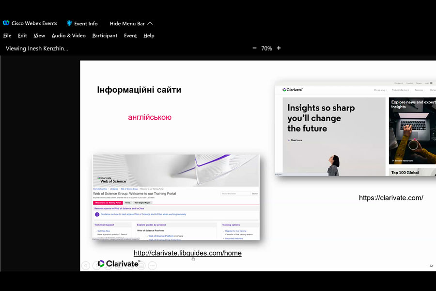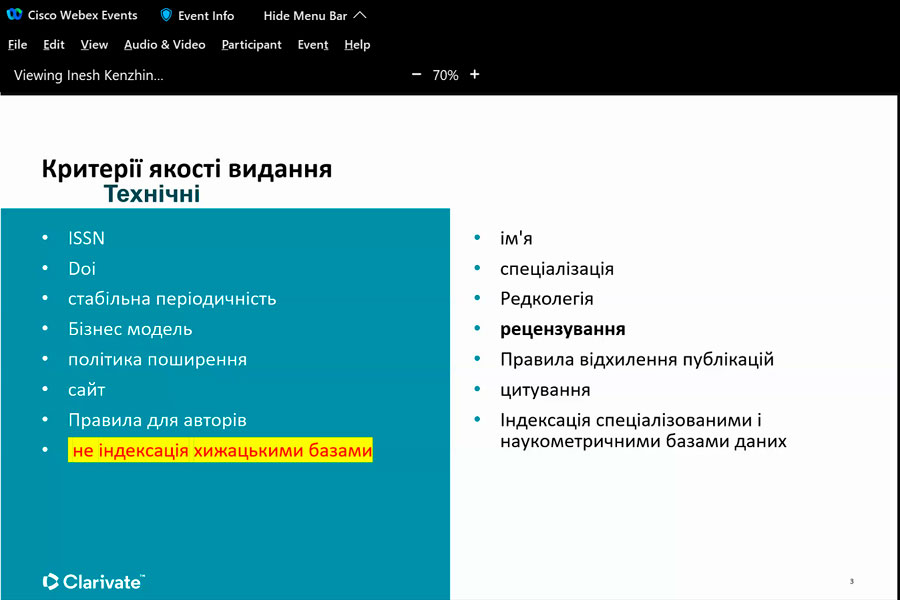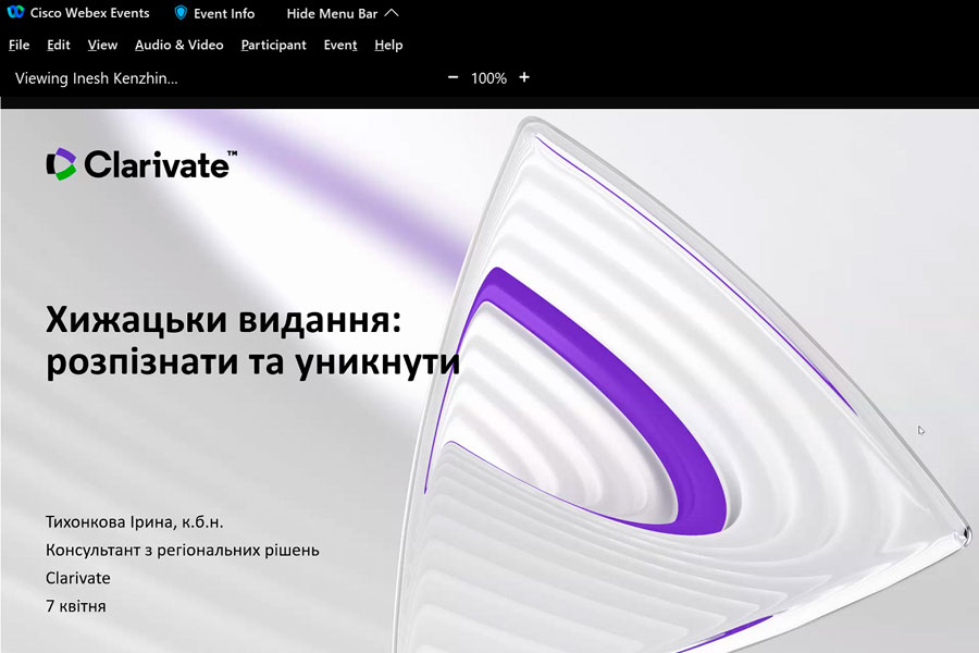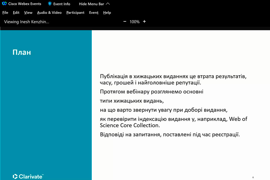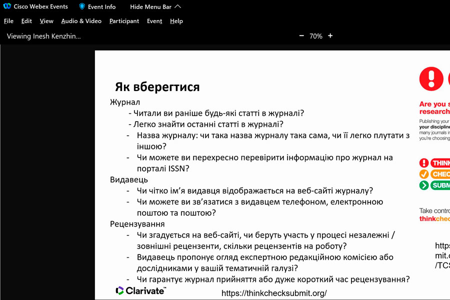 Під час вебінару було з’ясовано: як не припуститися помилки під час вибору видання для публікації власних наукових доробок; як уникнути публікації у хижацьких виданнях, на що варто звернути увагу під час добору видання; як розпізнати основні види хижацьких видань; які критерії якості видання слід брати до уваги; чи можна надрукуватися безкоштовно; чим загрожує публікація в хижацькому виданні і як від цього уберегтися; як перевірити індексацію видання у Web of Science Core Collection тощо. Це і ще багато іншого, цікавого та корисного дізналися науковці зі всієї України. Ознайомились із довідковою інформацією, з інформаційними сайтами, які нададуть змогу убезпечити себе від втрати отриманих наукових результатів, часу, грошей і найголовніше наукової РЕПУТАЦІЇ.