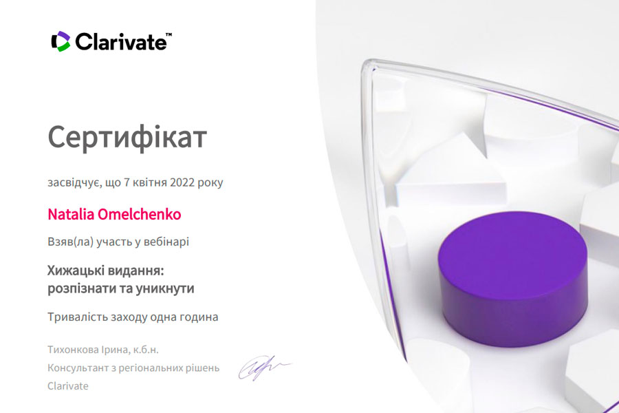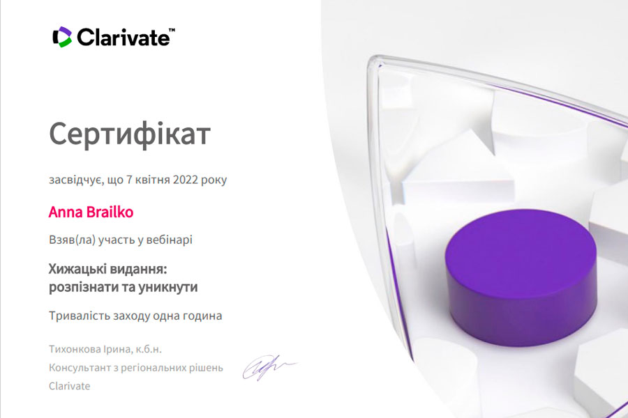 7 квітня викладачі кафедри товарознавства, торговельного підприємництва та експертизи товарів долучилися до роботи наукового вебінару з проблем захисту репутації науковців під час оприлюднення результатів наукових досліджень «Хижацьки видання: розпізнати та уникнути», який був проведений консультантом з регіональних рішень Компанії Clarivate Analytics (Головний офіс: Лондон, Велика Британія) Іриною Тихонковою.