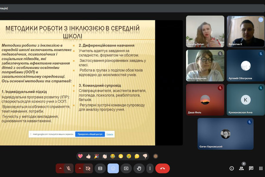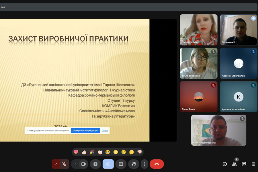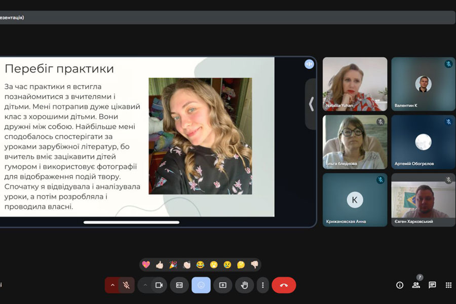 Педагогічна практика завершилася успішним захистом, який відбувся в режимі онлайн 30.04.2025 року. Із вступним словом виступила керівник практики, в.о. завідувача кафедри романо-германської філології, професор кафедри літературознавства, східної філології і перекладу Наталія ЮГАН. Студенти приємно вразили цікавими мультимедійними презентаціями, використаними новітніми методами, аудіо- та відеоматеріалами, представили власне бачення практичних завдань, продемонстрували належний рівень теоретико-методичної підготовленості до реалізації професійних навичок учителя французької мови, сумлінність та творчий підхід до виконання поставлених на період проходження практики завдань, розповіли про труднощі, що виникли у процесі навчально-виховної роботи.