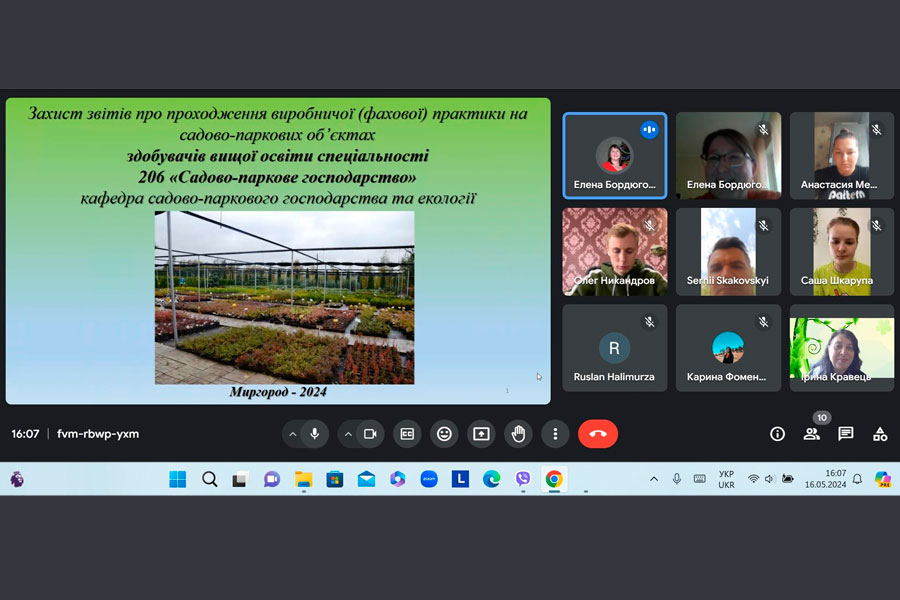 На кафедрі садово-паркового господарства та екології 21.05.2024 відбувся публічний захист звітів по завершенню фахової виробничої практики на садово-паркових об'єктах, яка проходила на підприємстві «Науково-виробнича компанія «Екопарк» для студентів спеціальності 206 Садово-паркове господарство.