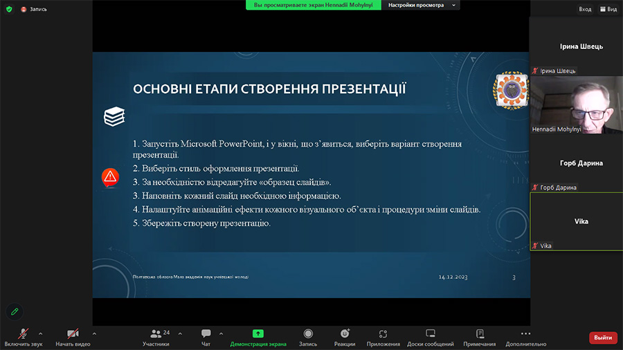 Учасники заняття ознайомились з метою розробки та основними етапами створення презентації. Геннадій Могильний наголосив, що графічне оформлення наукової доповіді є важливим елементом, який сприяє її наочності та зрозумілості. Правильно оформлені графіки, діаграми, таблиці та інші візуальні елементи допомагають аудиторії краще сприймати інформацію, а також роблять доповідь більш професійною та естетично привабливою.