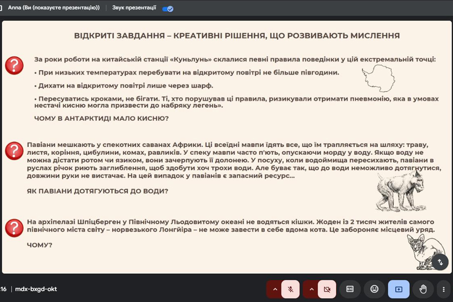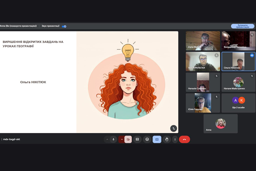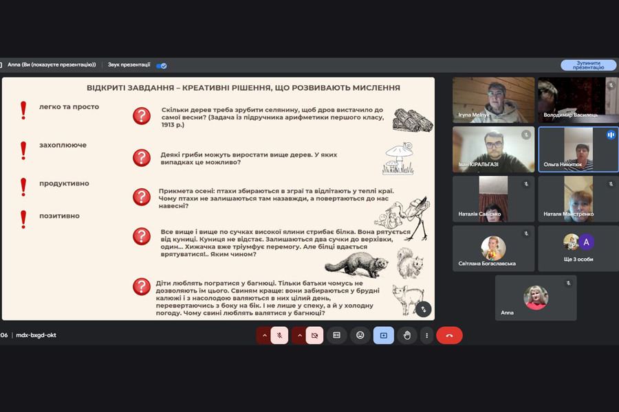 Випускниця магістратури 2025 р. за спеціальністю «Середня освіта (Географія)» Ольга НІКІТЮК провела тренінг на тему «Вирішення відкритих завдань на уроках географії». Доповідачка зазначила, що загалом є два типи завдань: закриті та відкриті. Закриті завдання мають чітку умову. В умові є все, що потрібно для вирішення такого завдання, нічого зайвого немає. Як правило, один спосіб рішення та одна правильна відповідь. На вирішенні переважно таких завдань й побудовано шкільну освіту. Фактично це навіть не завдання, а вправи щодо відпрацювання деяких інтелектуальних навичок, наприклад навичок застосування формул. Але у житті таких завдань практично немає! А ті, які зустрічаються, комп’ютер вирішує набагато швидше, ніж людина. Пані Нікітюк акцентувала увагу на тому, що життя сповнене відкритих завдань: з нечіткими, розпливчастими, до кінця незрозумілими умовами, з можливістю застосувати різні підходи до їх вирішення. Та й відповідь може бути спірною, неоднозначною, не єдиною: побудувати новий міст, виготовити верстат, вилікувати людину і навіть знайти собі нареченого чи наречену – будь-яка з цих справ вимагає вміння бачити та вирішувати відкриті завдання. Отже, відкриті завдання – це завдання, які не мають єдиного правильного рішення. Відкриті завдання відображають складність реального світу, у якому рідко є прості відповіді.