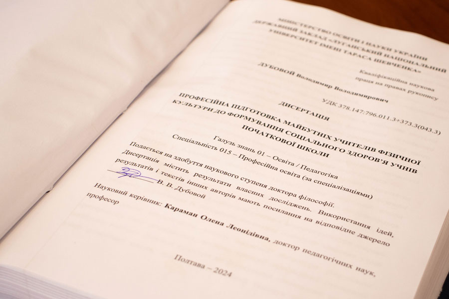 До розгляду і проведення захисту було представлено дисертацію на здобуття ступеня доктора філософії за спеціальністю 015 Професійна освіта (за спеціалізаціями) Дубового Володимира Володимировича на тему: «Професійна підготовка майбутніх учителів фізичної культури до формування соціального здоров’я учнів початкової школи».
